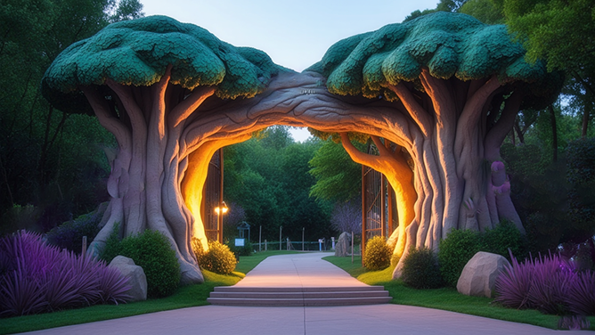 項目描述:在空曠的草原做生態園大門就像在大餐廳吃飯一樣,感覺一切都是小的,為體現生態園大門的氣勢,就要把生態園大門做得大,除了加大樹的高度、直徑,另外減少了樹枝樹葉,使整個樹形顯得頗具力感。我們所要做的就是不加大生態園大門尺寸的前提下讓生態園大門顯得高大。